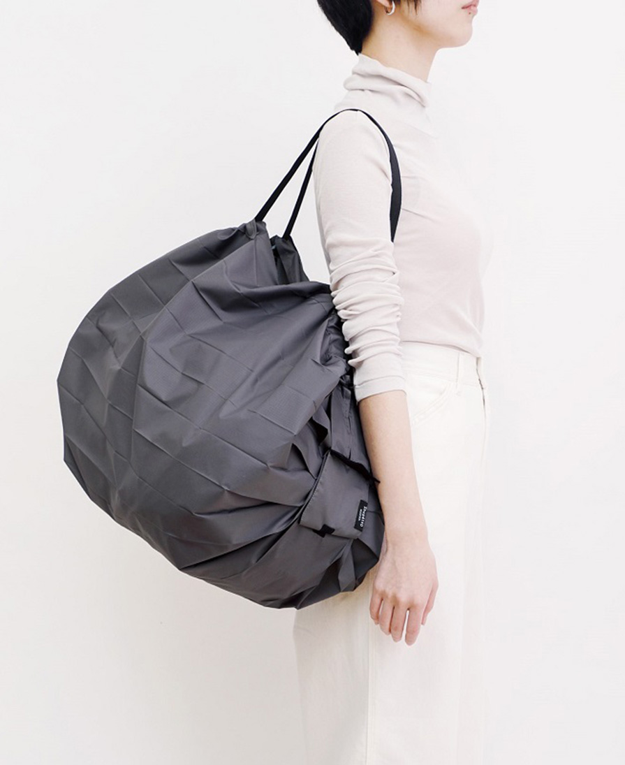 Shupâtto are bags from Japan whose pleated structure allows them to be rolled in a few motions and put them in attached pouch. This bag closes with a snap.