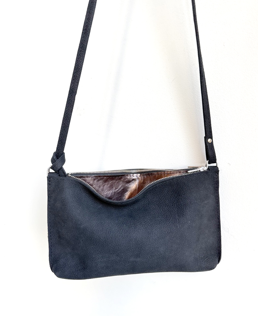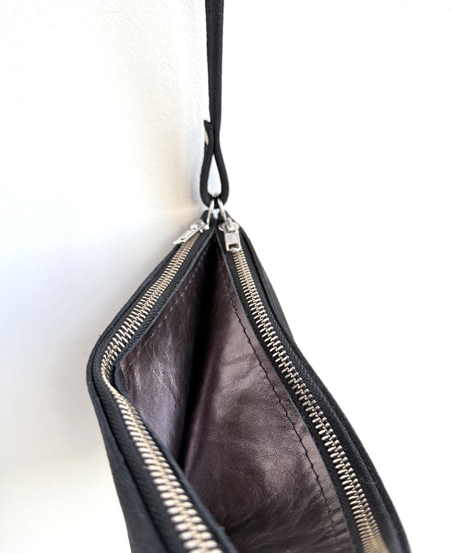 Double small bag for every day use, two zip compartments and one open pocket inbetween. Perfect to organize your belongings. Comes with an adjustable shoulderstrap so you can wear this bag in different ways. We make this bag in ever changing colors and on request in a color you can chose.