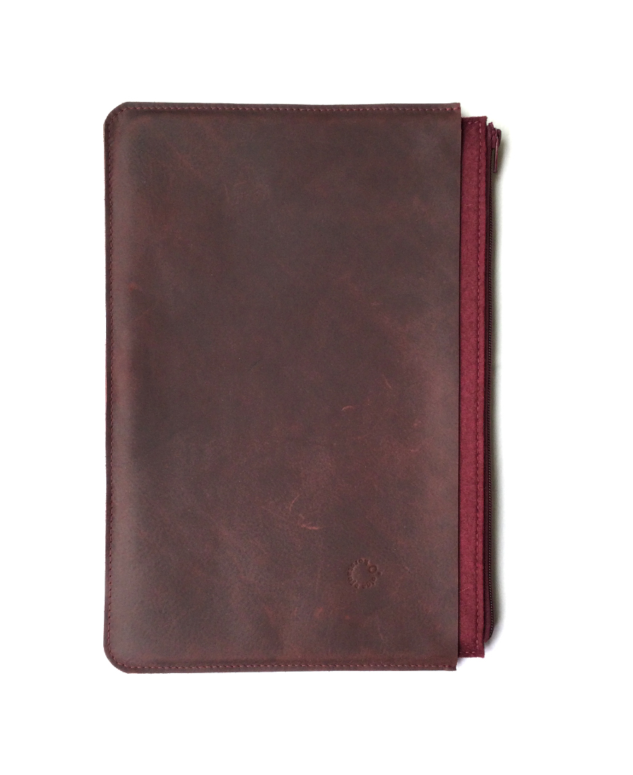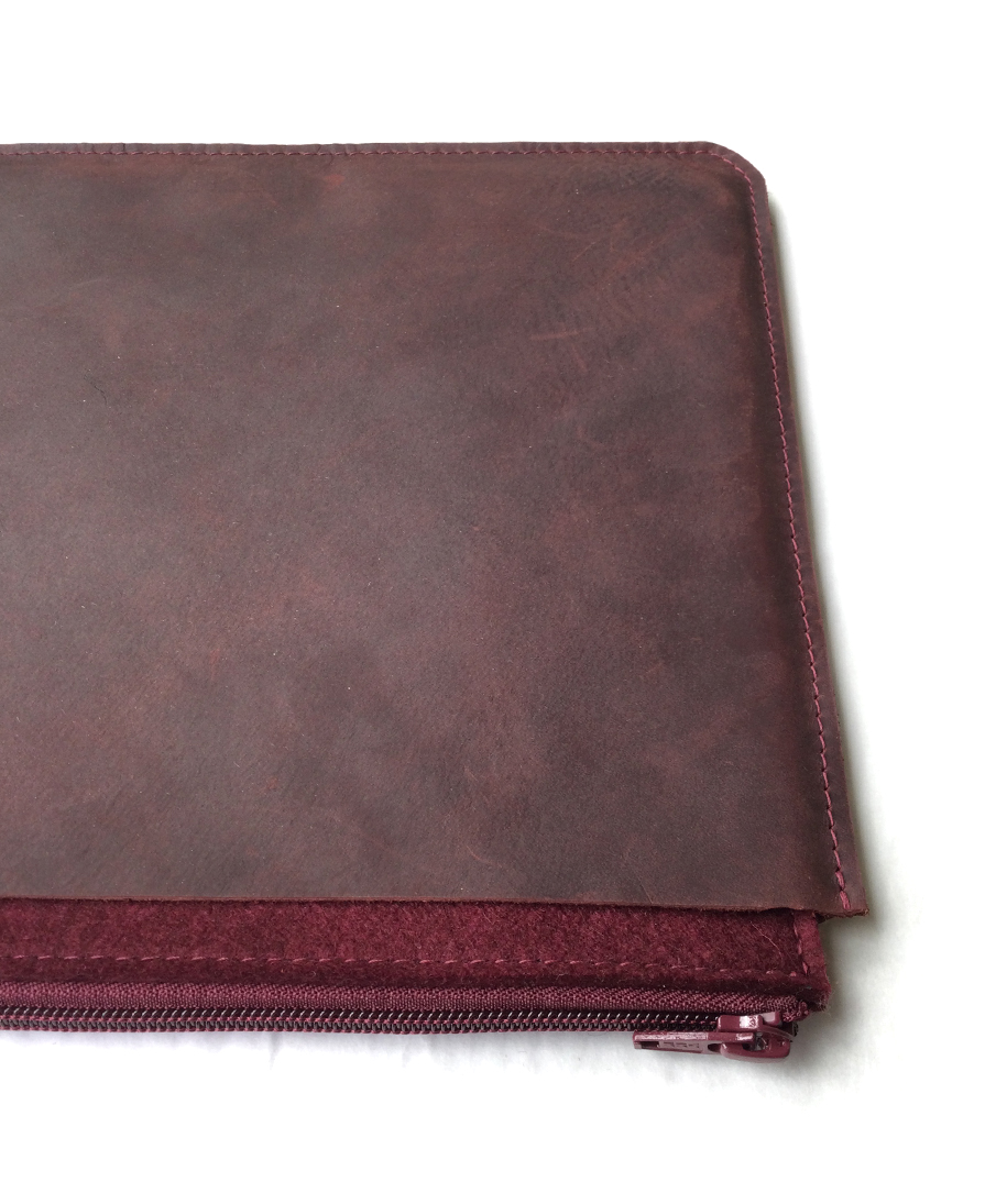 material: leather, woolfelt, nylon zipper measurements outer size : 37,5 x 26 cm. inner size: 36 x 23,5 opening zipper: 32.cm!