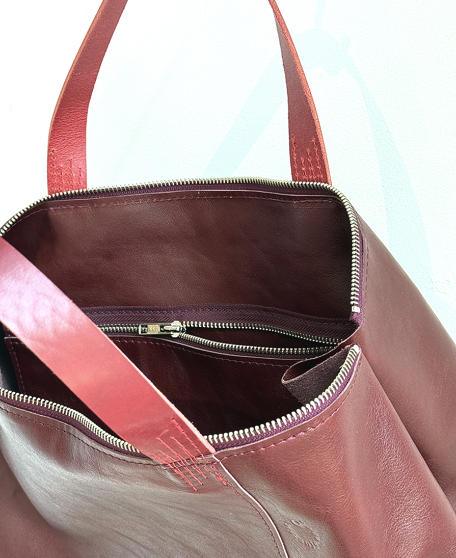 Handbag with zip-fastener. Two pockets inside – one with zipper, one open.