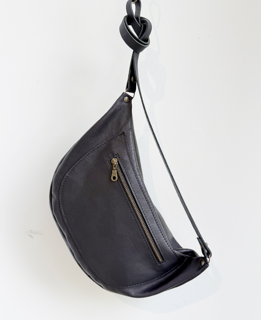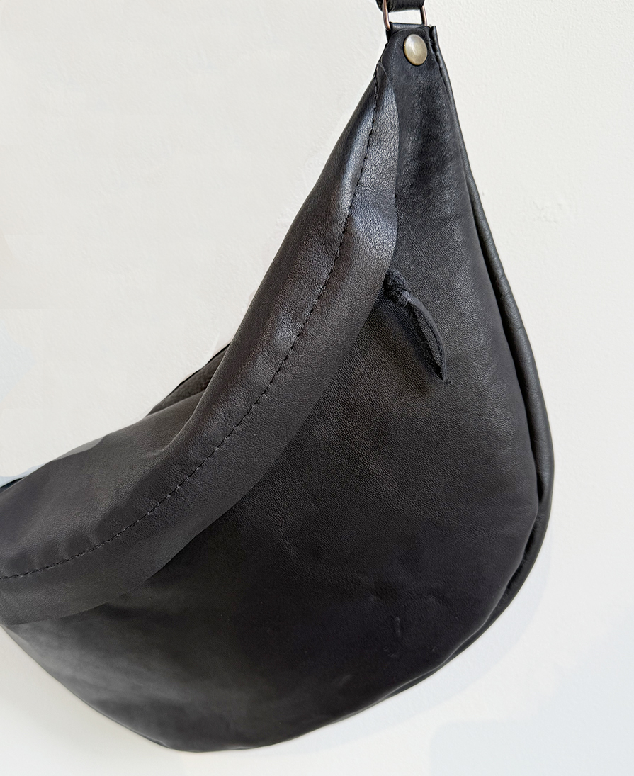 ‘Smile bold’ is a half round bag. Closed with a hidden zipper and the shoulder strap is adjustable. One extra zipped pocket on the back.