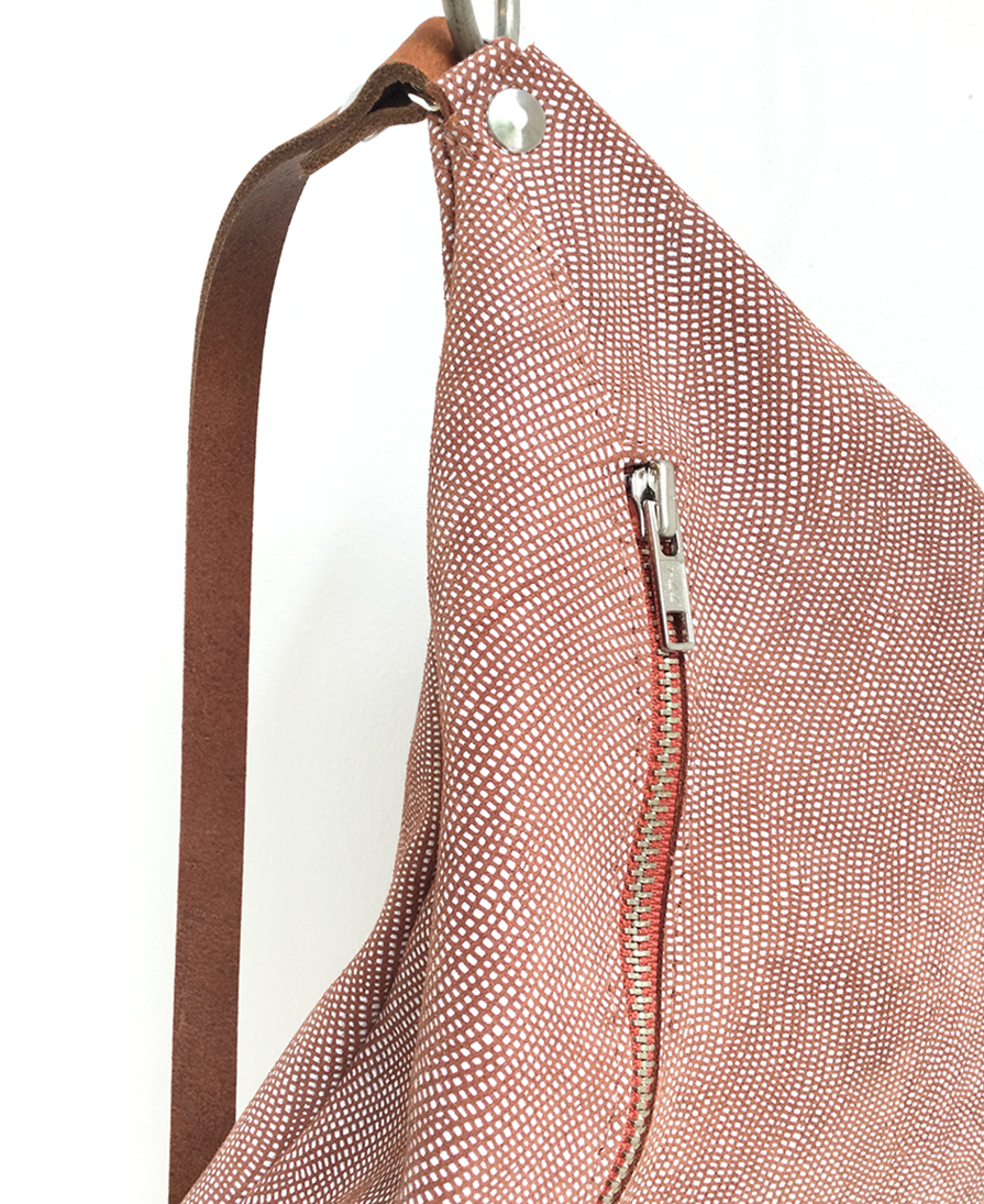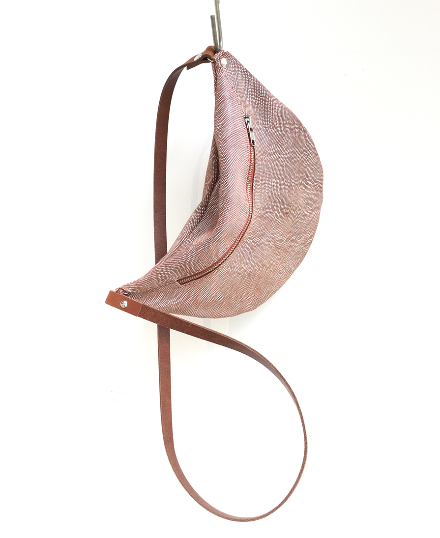 Smile is a kind of fanny pack. Closed with a zipper and the shoulder strap is adjustable. Just enough space for your phone, keys and cards.