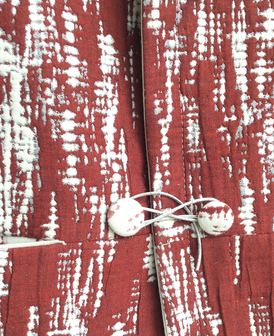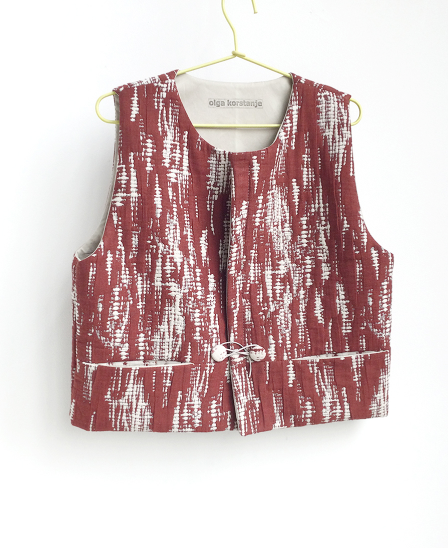 Gilet with hidden snap closure, two upholstered buttons with wrap-around string and two very small pockets. Lined with cotton. In just one size – depending on your breast size, approximately size 38/40.
