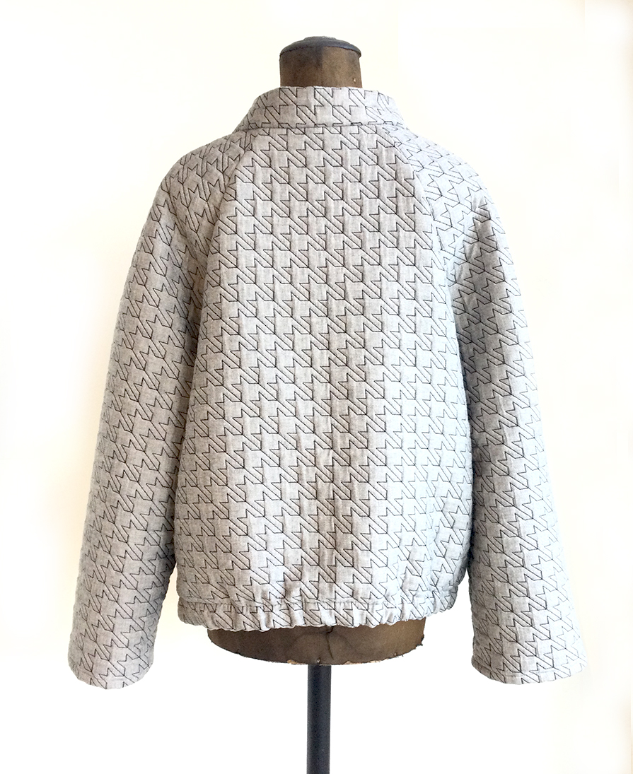 Jacket in grey/black jacquard. Two press buttons closure and a small open pocket inside,  Elastic band at the back so it folds slightly.