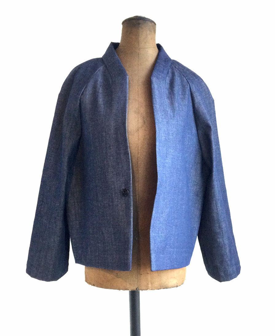 In store and online: jacket #001 and #002. The first jackets from a growing collection of own designs. Loose fit models, #001 has a deeper collar than #002. There is a ‘basic’ and a ‘bold’ model in both. Bold reminds of a bomber jacket because of the elastic band into the hem at the back. Lengths vary as does sleeve length. Sometimes it closes with a press button, a bow or buttons. Sometimes it is just open. All depending on the fabric. There is one size available which fits most people. The jackets are made in plain ramie fabric and in unique left-over fabrics from designers, mainly from the Netherlands, Belgium and France. These are very limited editions per type of fabric.