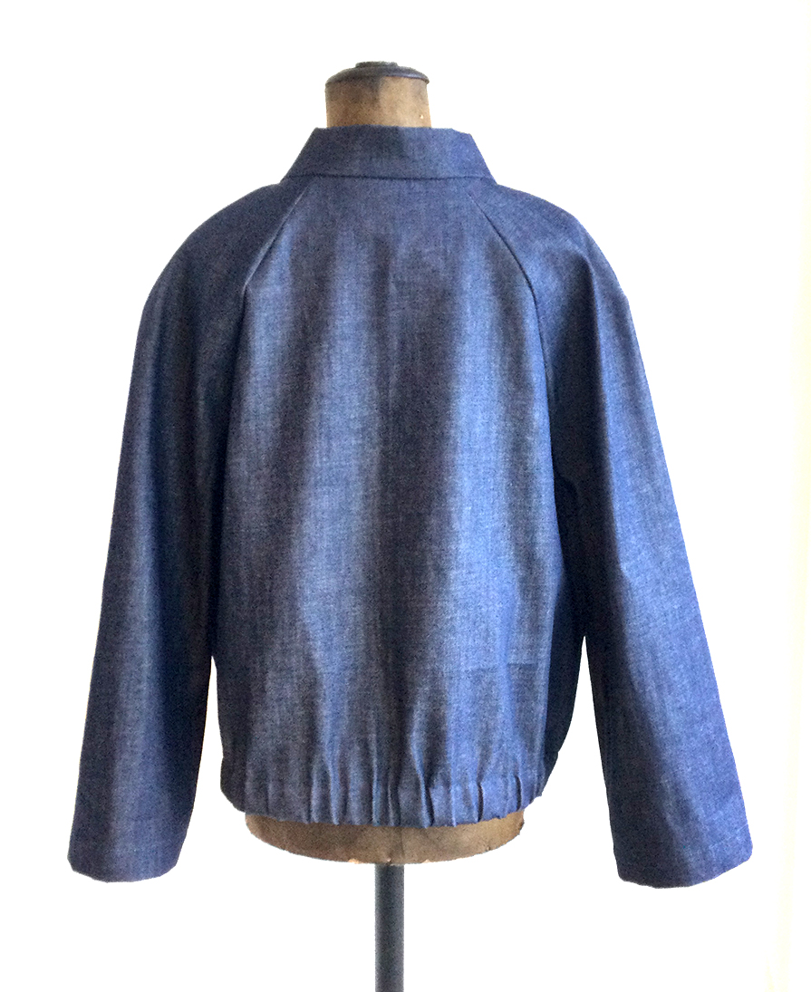Jacket in sturdy jeans. One press button closure and a small open pocket inside,  Elastic band at the back so it folds slightly.